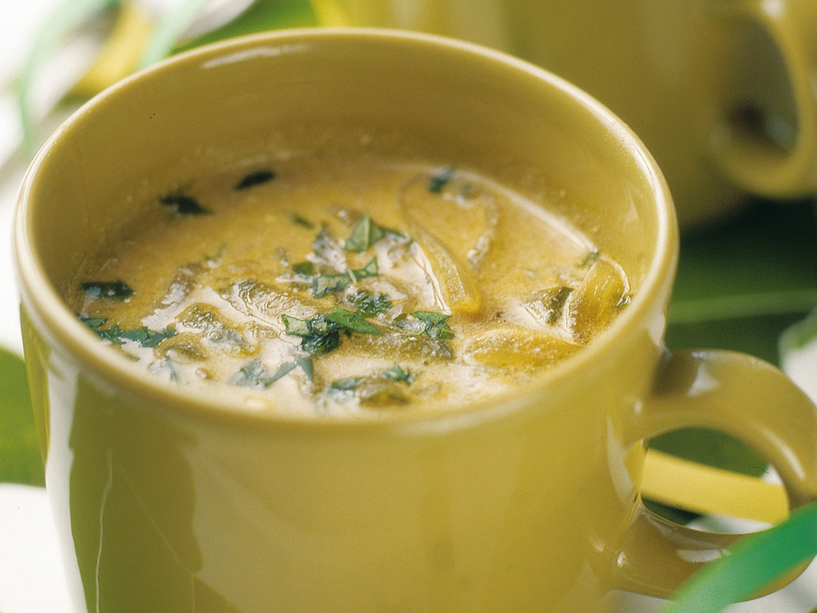 Sulata margariini kattilassa. Kuori ja leikkaa sipuli ja valkosipuli renkaiksi. Leikkaa kurkut ohuiksi suikaleiksi. Keitä kasviksia rasvassa noin 10 minuuttia. Mausta valkopippurilla. Lisää vesi ja fondi. Hienonna basilika ja lisää joukkoon. Anna kiehua vielä 10 minuuttia. Lisää ranskankerma ja kuumenna keitto. Hienonna keiton pinnalle basilikaa. Tarjoa heti.