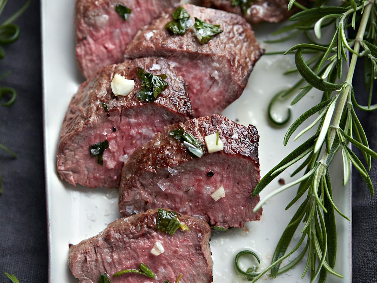 Mausta kypsennetyt lampaan ulkofileet valuttamalla päälle kuumaa yrtti-valkosipuliöljyä.