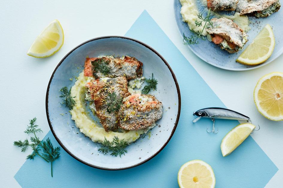 Herkulliset silakkapihvit täytetään kylmäsavulohella ja yrttisellä tuorejuustolla. Rapean pinnan silakkapihveille antaa ruisjauho-seesaminsiemenleivitys, nam!