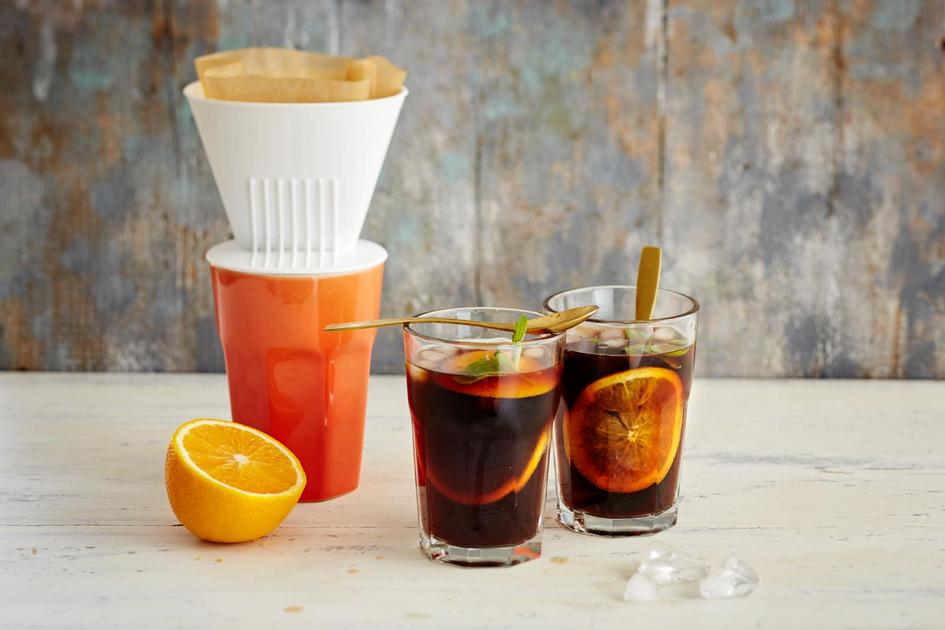 Sekoita siirappi, mehu ja kolajuoma kahviin. Lisää jääpaloja laseihin ja kaada juomaa päälle. Koristele drinkit appelsiiniviipaleilla.