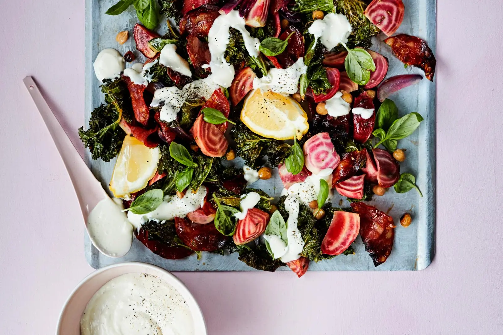 Lämmin raitajuuri-chorizosalaatti on hitti! Salaatin makupalettia värittävät paahtunut raitajuuri, rapea lehtikaali, lempeät kikherneet ja suolainen chorizo.