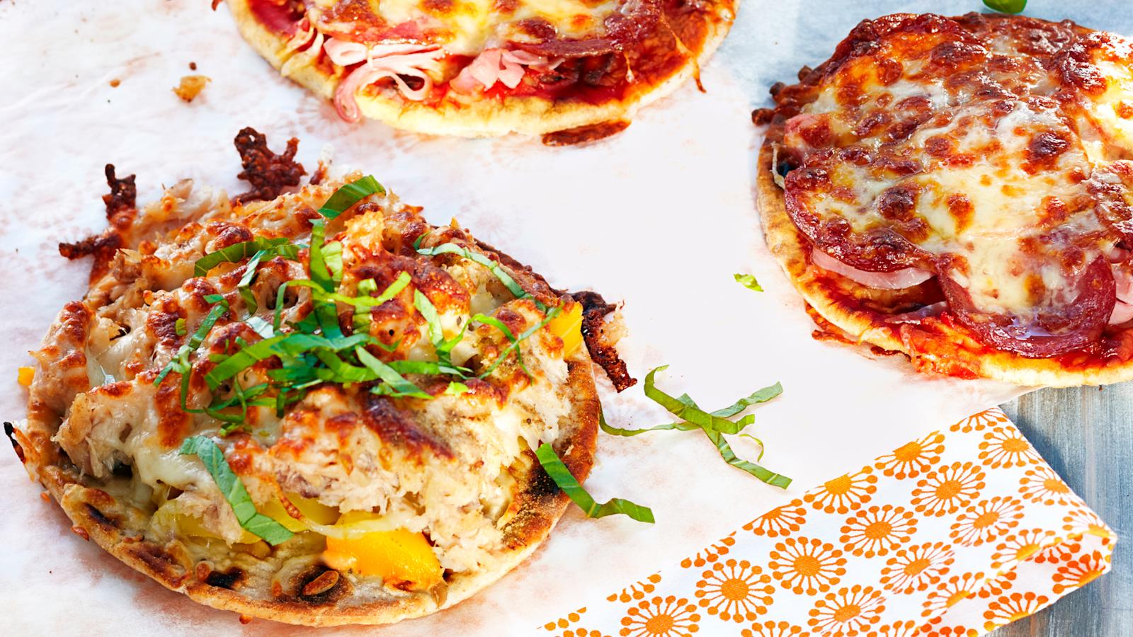 Tee pizzamaisia lämpimiä leipiä helposti ja nopeasti pienistä rieskoista. Tee leivät joko mango-tonnikalatäytteellä tai salami-kinkkutäytteellä.