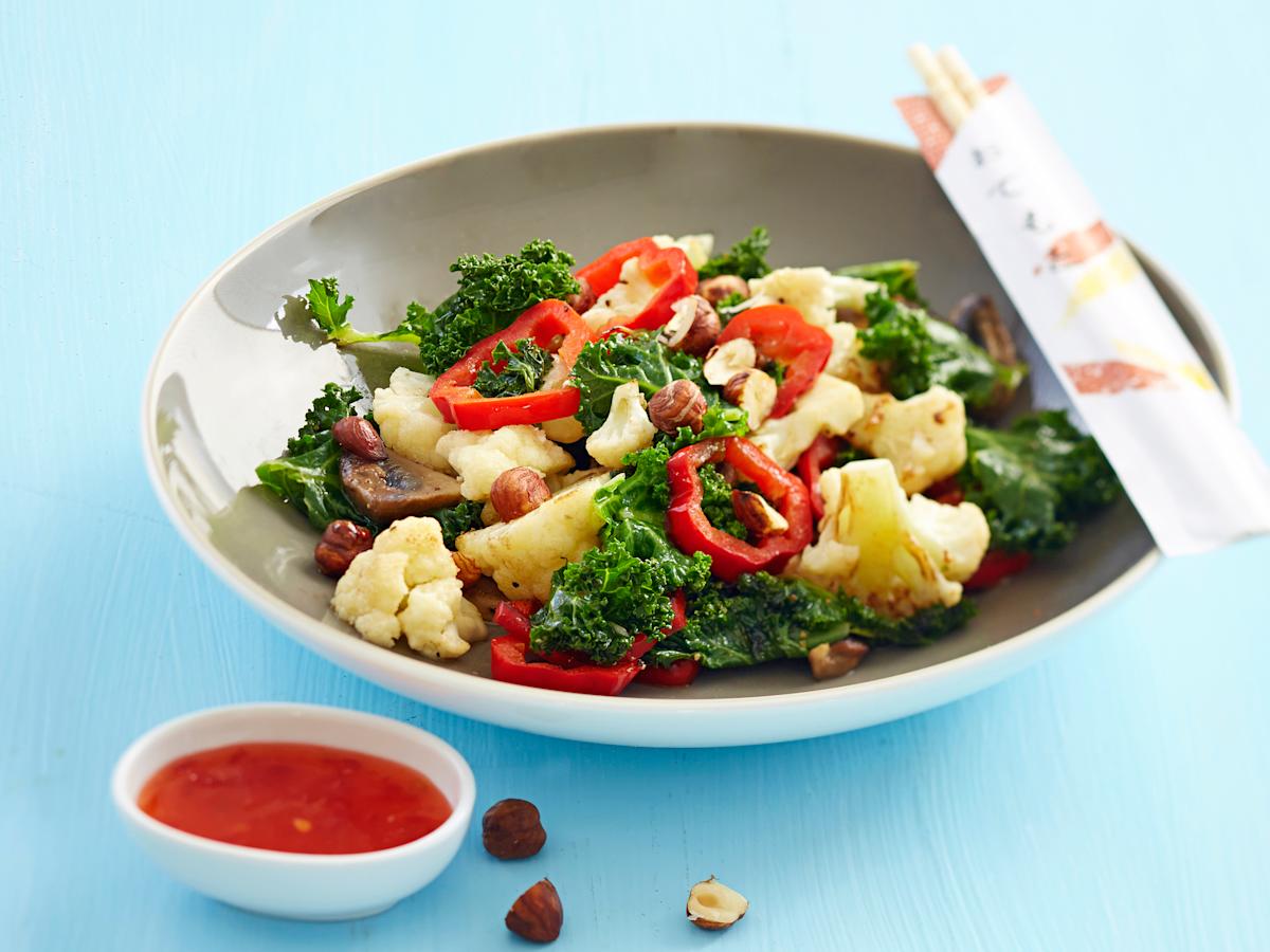 Poista lehtikaalista paksut ruodit. Ryöppää lehtiä hetki kiehuvassa vedessä, valuta ja pilko lehdet. Viipaloi herkkusienet, suikaloi porkkanat ja paprika. Hienonna valkosipuli, chili ja inkivääri. Kuumenna öljy vokissa, lisää kasvikset ja paista sekoitellen viitisen minuuttia. Lisää soija, siirappi, sitruunamehu ja mausteet. Kuumenna ja lisää pinnalle rouhitut pähkinät. Tarjoa riisin kanssa.
