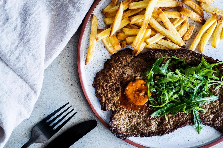 Lehtipihvit ovat pikaruokaa, sillä ne kypsyvät muutamassa minuutissa. Kruunaa pihvi paprikavoilla ja sitrusvinegretissä pyöräytetyllä rucolalla.