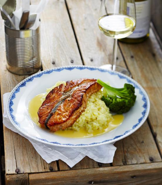 Tarjoile paistetun lohen kanssa esimerkiksi risottoa ja höyrytettyjä kasviksia.