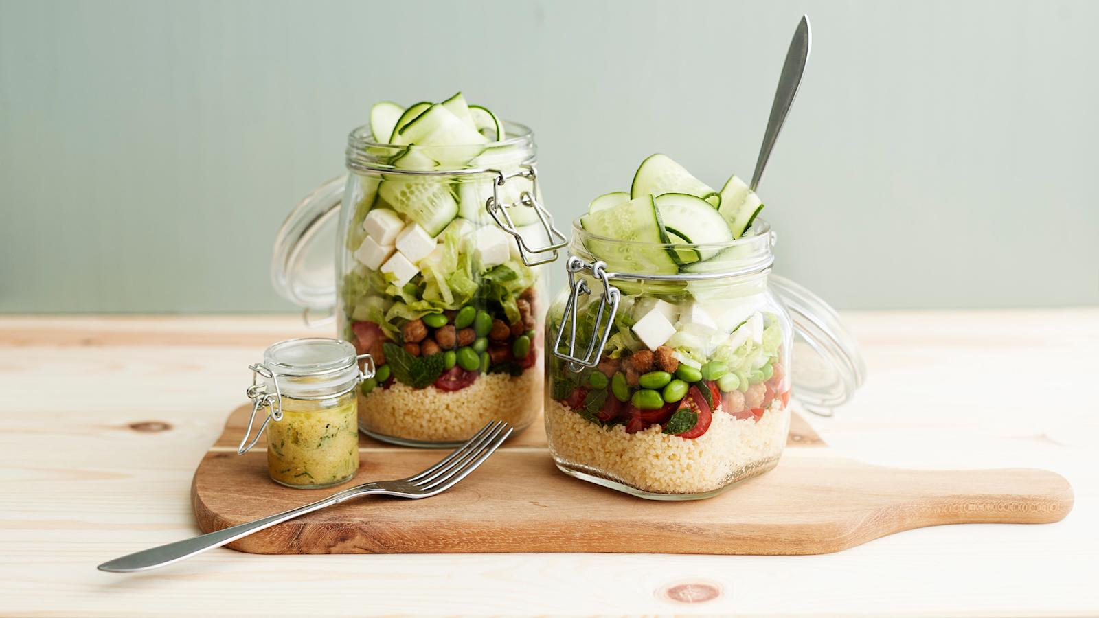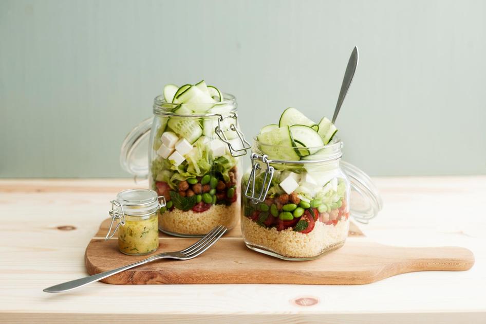 Kokoa salaatti kahteen purkkiin. Jaa couscous purkkien pohjalle ja laita sen päälle minttu-tomaattiseos. Lisää kikherneitä, edamamepapuja ja salaattia. Lisää lopuksi feta ja kurkkusuikaleet. Laita kastike erilliseen astiaan ja lisää salaattiin ruokailun yhteydessä.