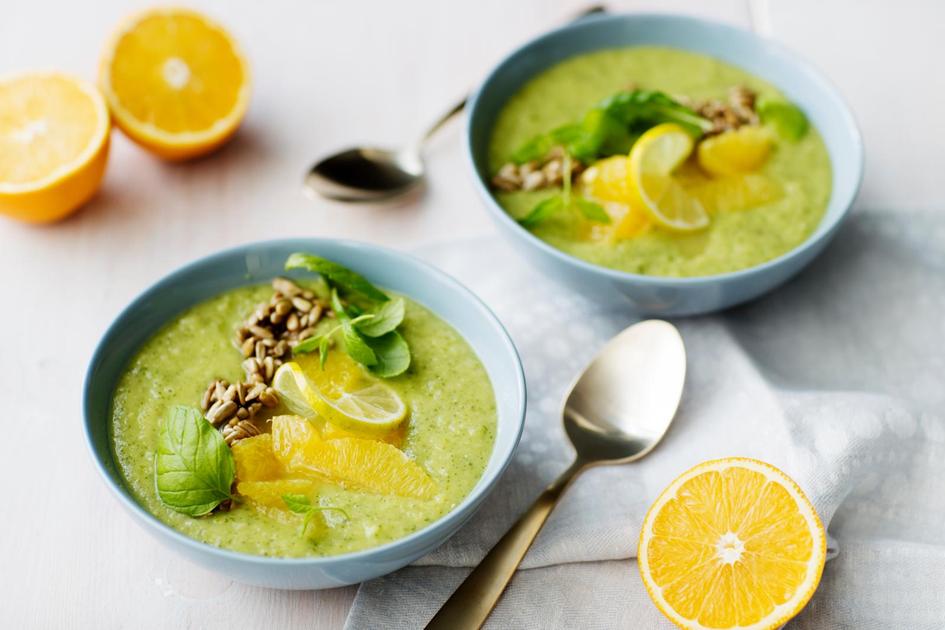 Määrä Ainesosa 2 kpl avokadoa 4 kpl appelsiinia 2 kpl vihreää omenaa 2 kpl limeä 1 kpl ruukku minttua 4 dl kivennäisvettä 2 rkl hunajaa - 3