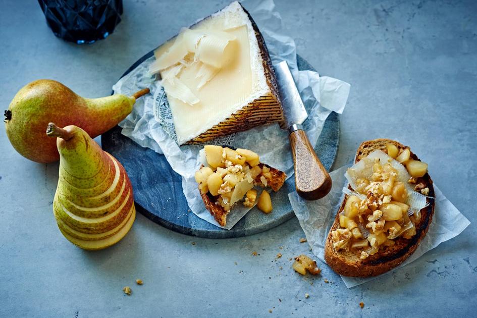 Täyteläisellä lampaanmaitojuustolla päällystetyt leivät saavat makuparin karamellisoiduista päärynöistä ja rapeutta pähkinöistä. Tarjoa alkupalaksi tai illanistujaisissa salaatin kanssa.