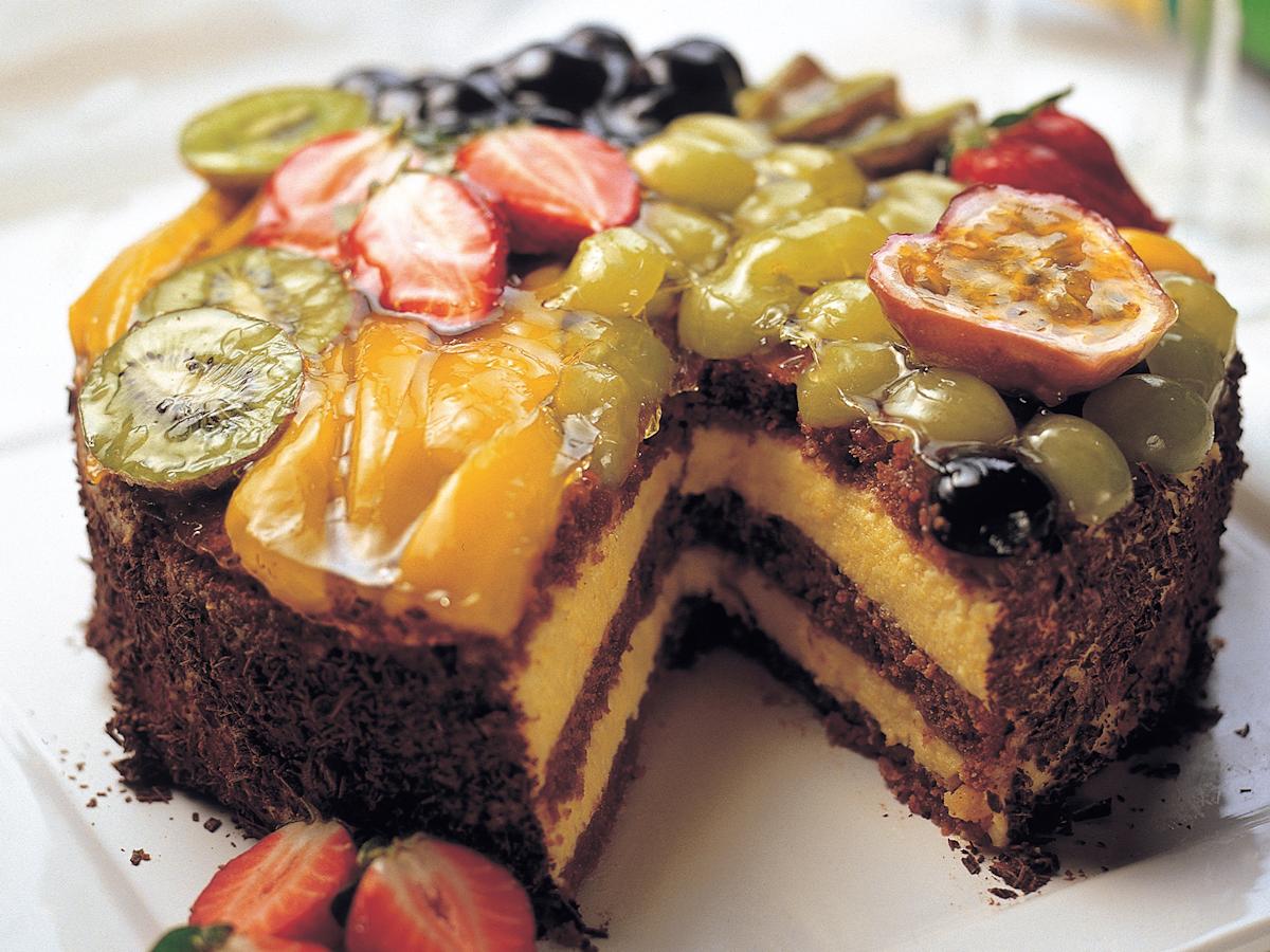 Asettele päälle viipaloidut hedelmät. Valmista päälle kiille hyytelösokerista pakkauksen ohjeen mukaan. Irrota kakku vuoasta. Levitä suklaaraaste reunoille.