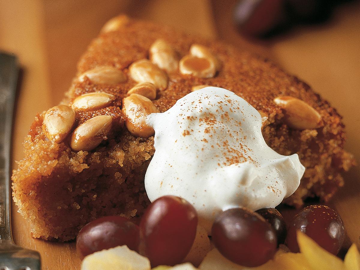 Kuumenna uuni 225 asteeseen. Sulata margariini. Sekoita kaikki raaka-aineet keskenään. Kaada taikina voideltuun irtopohjaiseen kakkuvuokaan ja koristele pinta kokonaisilla manteleilla. Paista noin 30 minuuttia. Kaada siirappi kuuman kakun päälle ja pidä kakku kelmun tai kannen alla, jotta se säilyttää kosteutensa. Tarjoa hedelmien ja kermavaahdon tai vaniljakastikkeen kanssa.