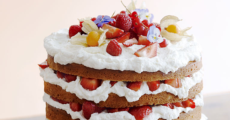 Aseta toinen kakkupohjasiivu päälle ja lisää jälleen mansikoita ja mascarponekermaa. Tee sama kolmannen kanssa. Muista säästää ylimpään kerrokseen riittävästi mascarponekermaa.
