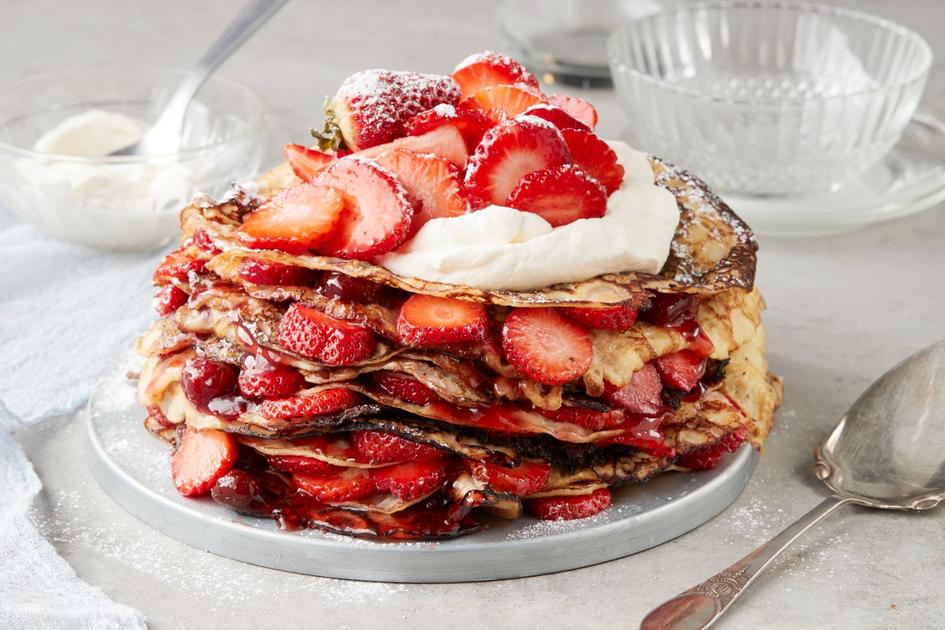 Voiko mikään olla ihanampaa kuin keko vastapaistettuja lettuja? Täytä lettukakku tuoreilla mansikoilla sekä mansikkahillolla ja kruunaa nokareella kermavaahtoa.