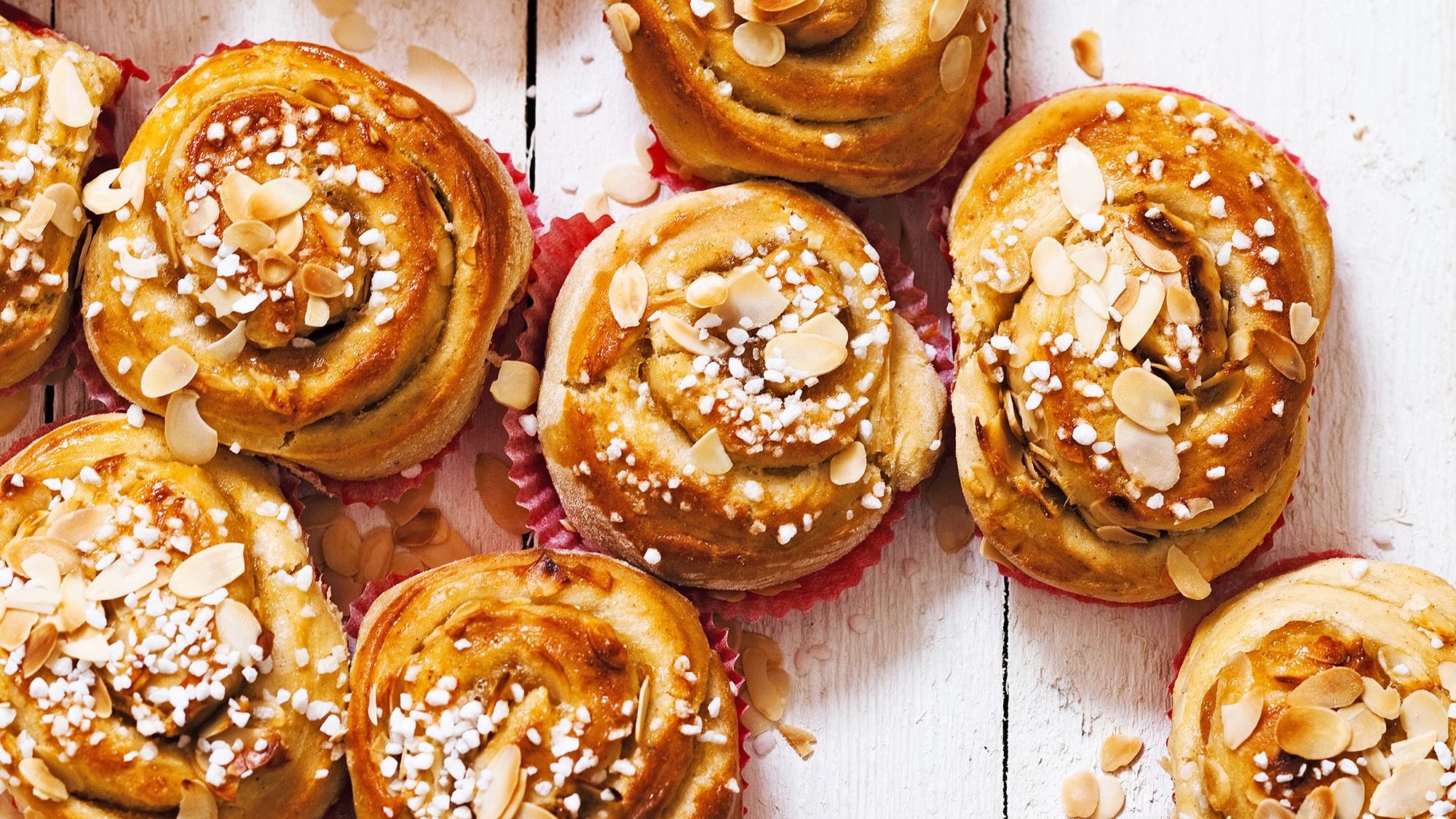 Sulata margariini. Lisää maito ja kuumenna kädenlämpöiseksi. Kaada margariini-maitoseos leivontakulhoon ja liuota sekaan murennettu hiiva. Lisää suola, sokeri, kananmuna ja kardemumma. Alusta taikinaan jauhot vähän kerrallaan ja voimakkaasti vaivaten.Kohota peitettynä vedottomassa paikassa tunnin ajan.Kumoa kohonnut taikina jauhotetulle leivonta-alustalle. Vaivaa taikinasta ilmakuplat pois. Kauli taikina kahdeksi suorakaiteen muotoiseksi (n. 30 cm x 20 cm) levyksi.Levitä levyille hillo ja mantelilastut. Kääri levyt rullalle. Ota rullasta noin 4 cm leveitä viipaleita ja nosta ne leikkuupinta ylöspäin paperisiin muffini-/pullamuotteihin. Siirrä vuoat uunipellille.Kohota peitettynä 30 minuuttia. Voitele vatkatulla kananmunalla ja ripottele päälle raesokeria. Paista pullat kauniin värisiksi 225-asteisen uunin keskitasolla 10–15 minuuttia.