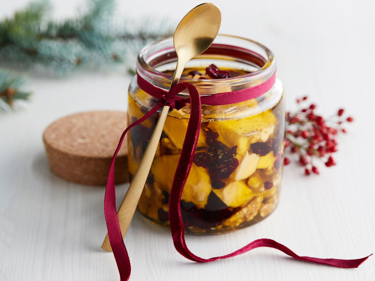 Purkita juustosta, pähkinöistä ja karpaloista oikea herkkujen herkku. Marinadiksi riittää oliiviöljy ja mausteiksi oregano ja pippuri.