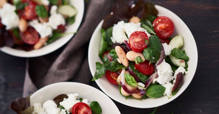 Leikkaa kurkku ja tomaatit pienemmiksi. Halkaise oliivit, poimi mintunlehdet ja revi salaatti. Sekoita kaikki papujen joukkoon ja viimeistele fetajuustolla.