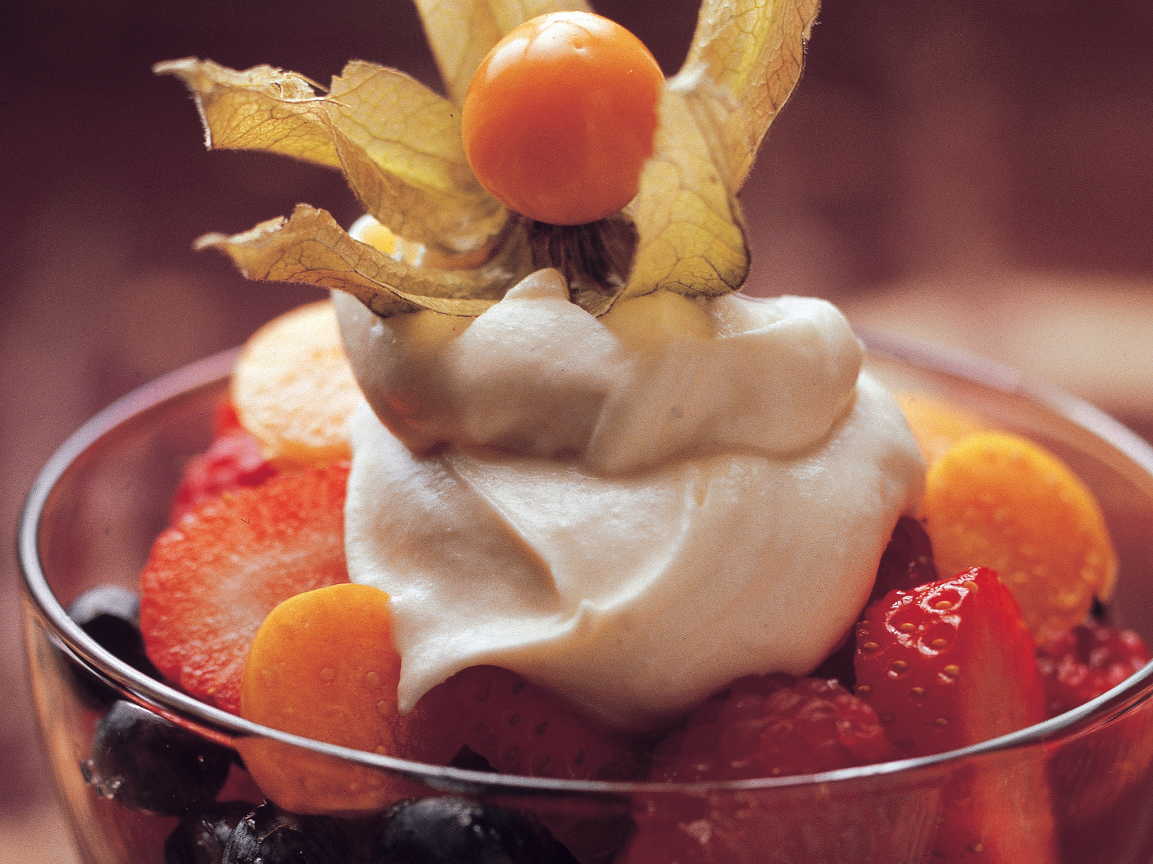 Helppo ja herkullinen valkosuklaavaahto maistuu marjojen kanssa. Annostele marjasalaatti jälkiruokakippoihin, lisää päälle valkosuklaavaahtoa maun mukaan ja koristele ananaskirsikoilla.
