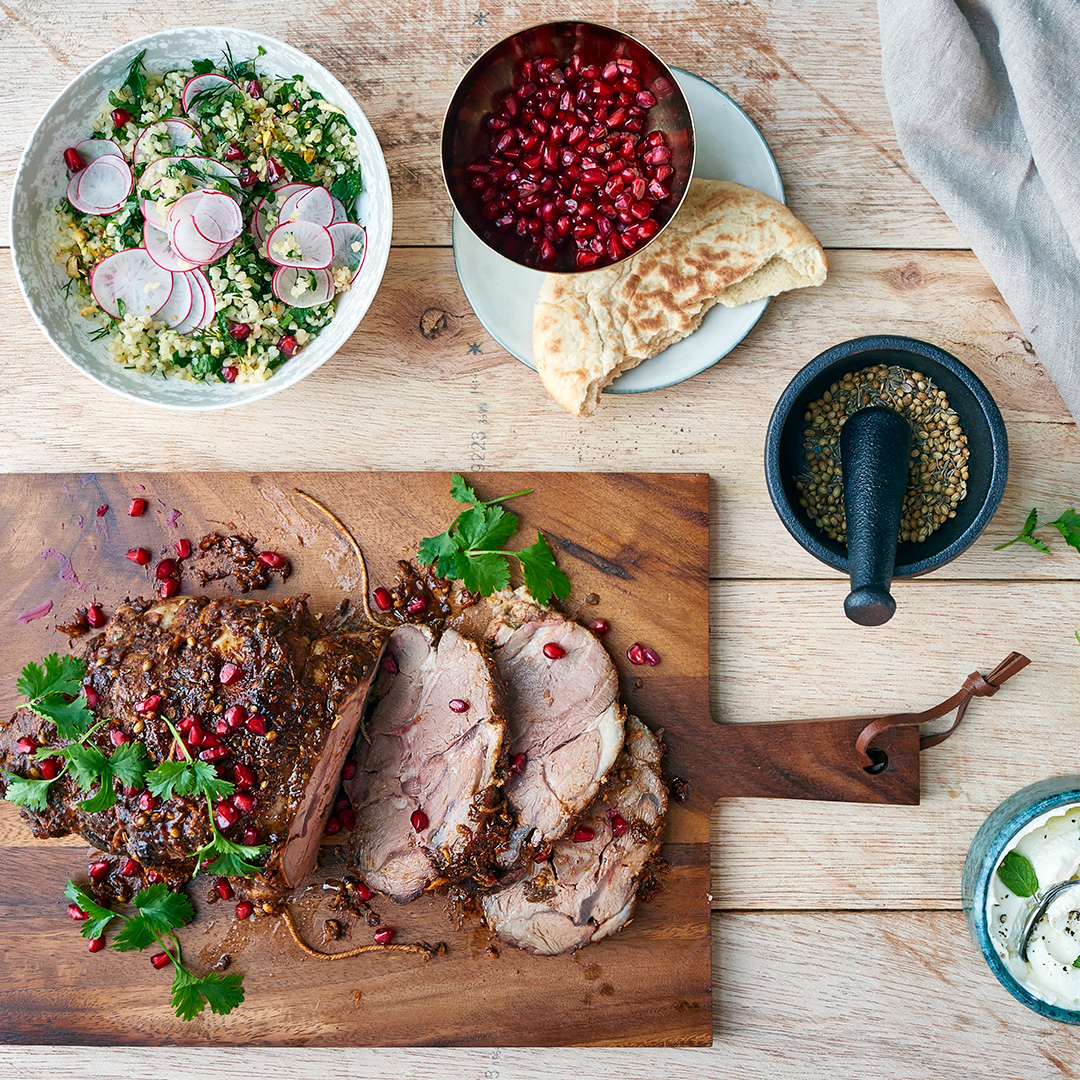 Tarjoa tabboulehin, pitaleivän ja tuorejuuston kanssa. Aseta tarjolle myös herkullinen liemi, joka muodostui uunivuoan pohjalle paistonesteestä ja marinadista.