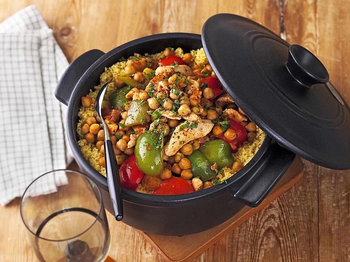 Paahda broilerisuikaleet kasarissa. Lisää joukkoon hienonnettu sipuli, juustokumina sekä inkivääri ja kääntele seosta hetki. Lisää vesi, tomaattisose ja chilitahna. Paloittele paprikat ja valuta kikherneet. Lisää ne joukkoon ja anna padan hautua kannen alla 5–8 minuuttia. Mausta ja tarjoile esimerkiksi couscousin kanssa.