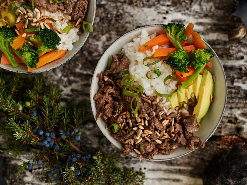Trendikäs kulhoruoka yhdistelee suomalaista käristyslihaa ja aasialaisia makuja! Kokoa kulho aasialaisittain maustetusta käristyslihasta, riisistä ja kasviksista.