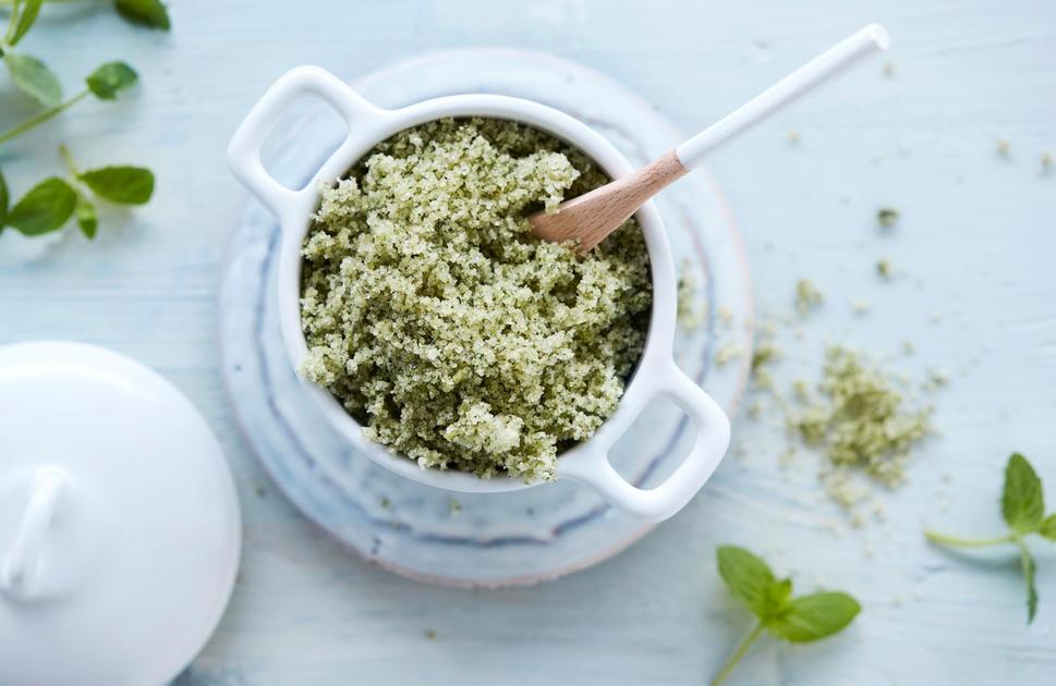 Sekoita tuore minttu sokerin kanssa kauniin vihreäksi minttusokeriksi. Mausta sokerilla jälkkärit, juomat, lasin reunat tai sujauta purkkiin ja vie lahjaksi.