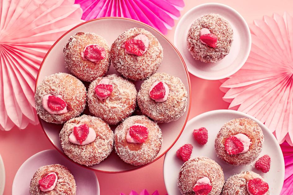 Munkit saavat sisälleen vadelmaisen tuorejuustotäytteen. Pikkumunkkien pinnalla on lempeän kirpeää sokeria.