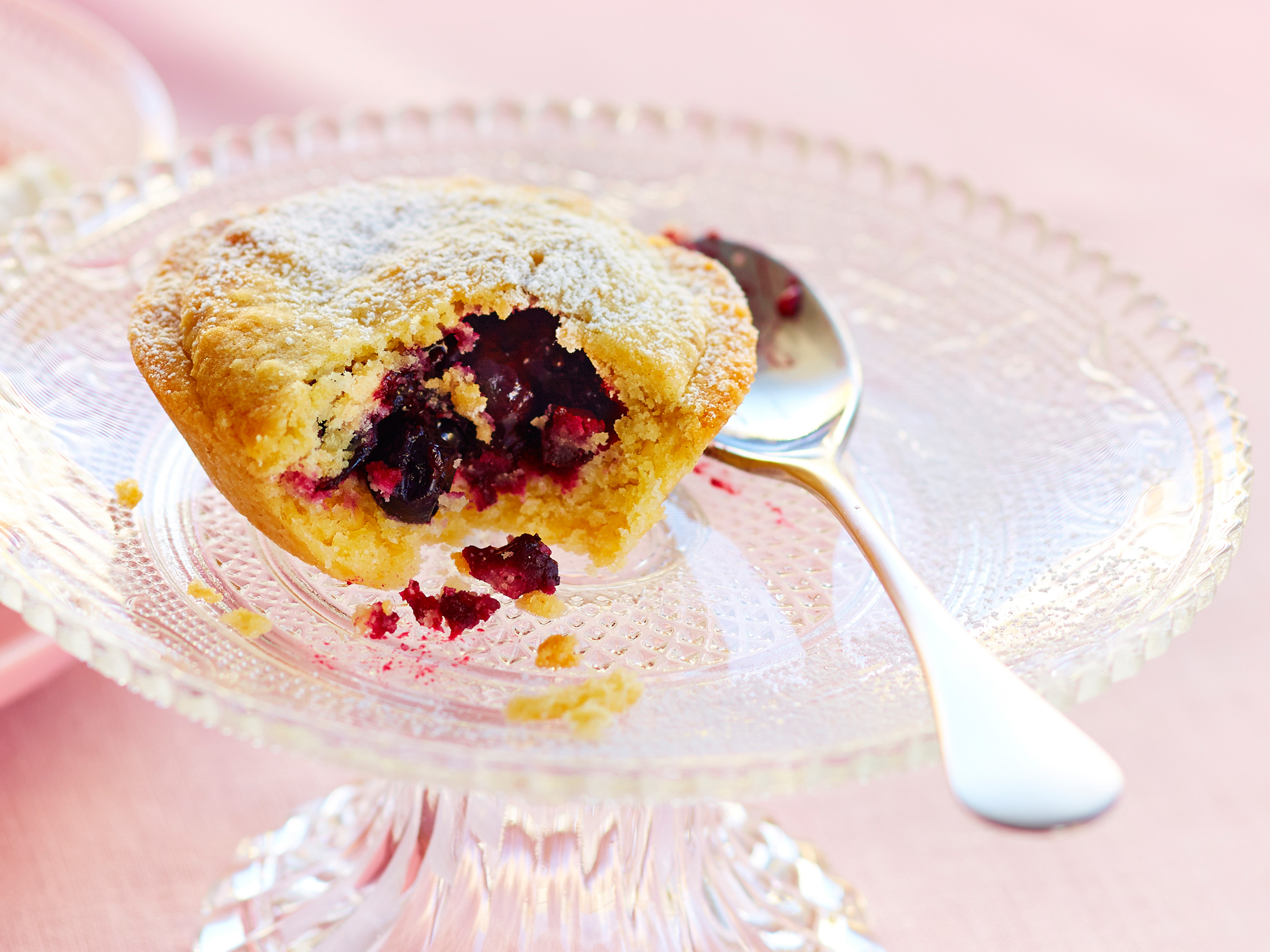 Painele kiekot voideltujen muffinivuokien pohjalle ja reunoille. Sekoita kulhossa puolikohmeiset marjat, sokeri ja perunajauhot keskenään. Jaa seos taikinasyvennyksiin.