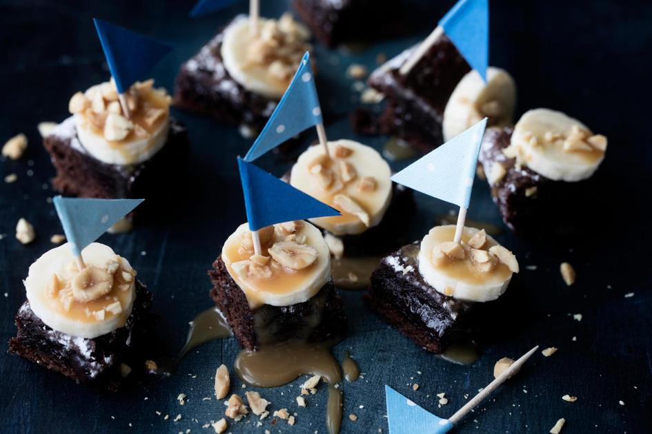 Pistä banaaniviipale cocktailtikulla mutakakkuun. Valuta päälle kinuskikastiketta ja viimeistele suolapähkinärouheella.