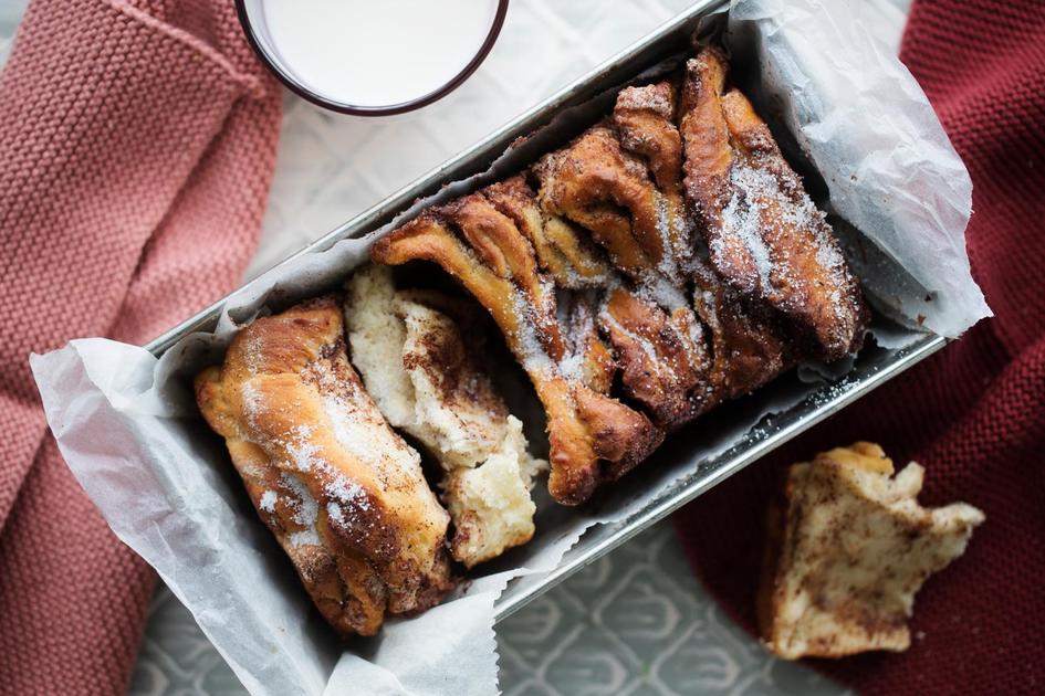 Perinteinen korvapuusti saa uuden muodon muhkeana nyhtöpullana, joka kasataan pitkulaiseen leipävuokaan.