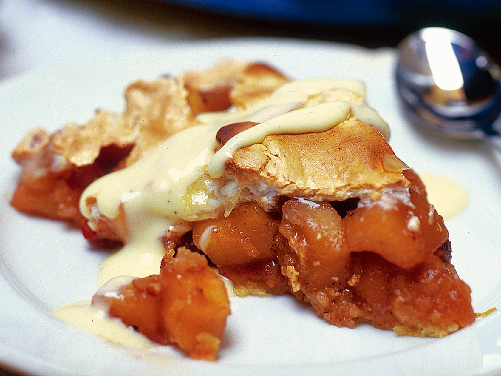 Kuumenna uuni 200-asteeseen. Sulata murotaikina pakkauksen ohjeen mukaan. Painele taikina suuren (halkaisija noin 30 cm) voidellun piirakkavuoan pohjalle ja reunoille. Kypsennä 25 minuuttia. Kuori ja kuutioi omenat. Sulata rasva kattilassa, lisää sokeri, kaneli, rusinat ja omenakuutiot. Keitä miedolla lämmöllä ilman kantta noin 15 minuuttia. Siirrä levyltä, ja lisää mantelirouhe ja halutessasi calvados. Vaahdota valkuaisia ja suolaa hetki. Lisää sokeri ja vatkaa kovaksi vaahdoksi. Lisää joukkoon mantelilastut. Kokoa omenapiiras kaatamalla omenatäyte esipaistetun piiraspohjan päälle. Päällystä mantelimarengilla. Nosta uunin lämpötila 225 asteeseen ja paista piirasta vielä noin 12 minuuttia.