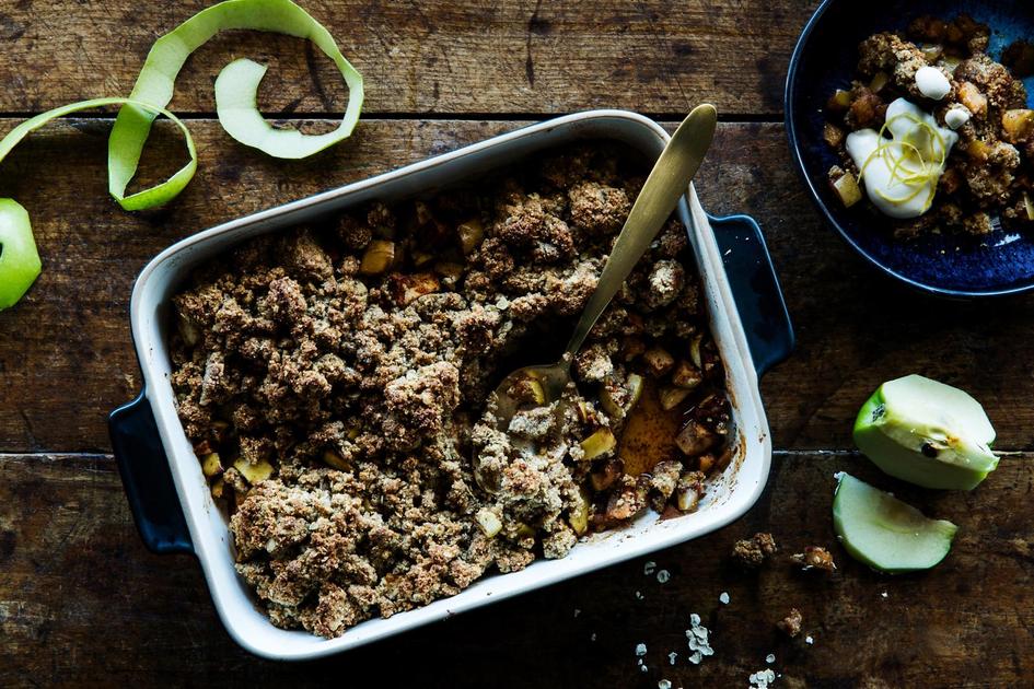 Omenakukon ruiskuoressa on ripaus kauraa ja täytteessä muskottia ja kanelia. Perinneherkun uudet maut nautitaan lämpimänä vaniljakastikkeen kanssa.