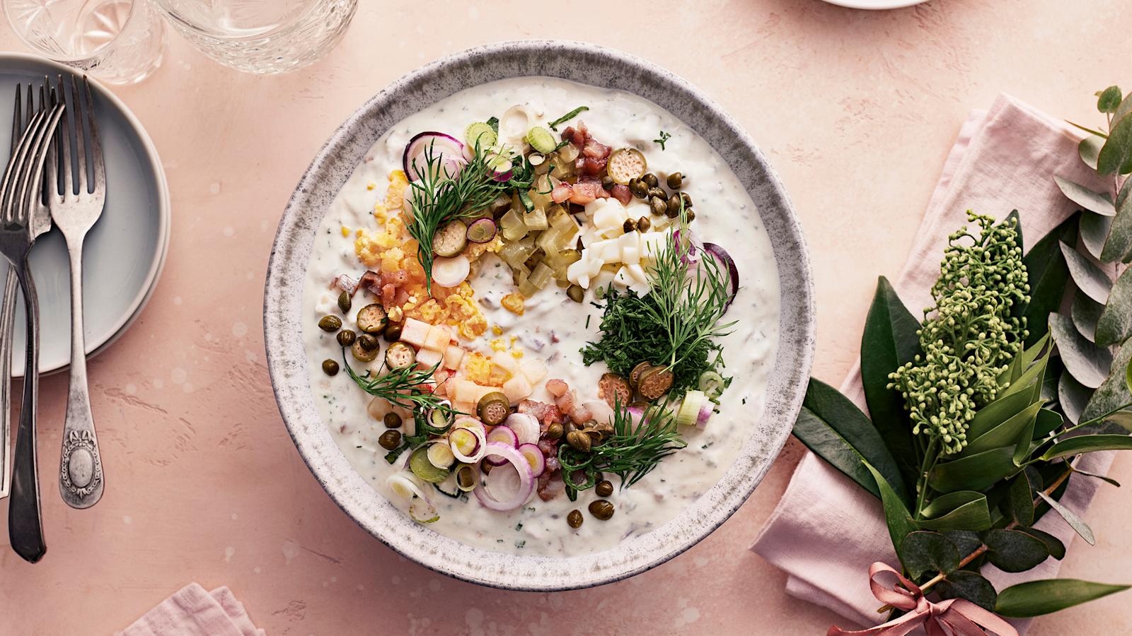 Määrä Ainesosa 1 kpl kevätsipuli 3 rkl tilliä hienonnettuna 2 kpl kananmunaa 1 kpl maustekurkku 1/2 kpl omena (hapan lajike) 2 rkl kapriksia - 4