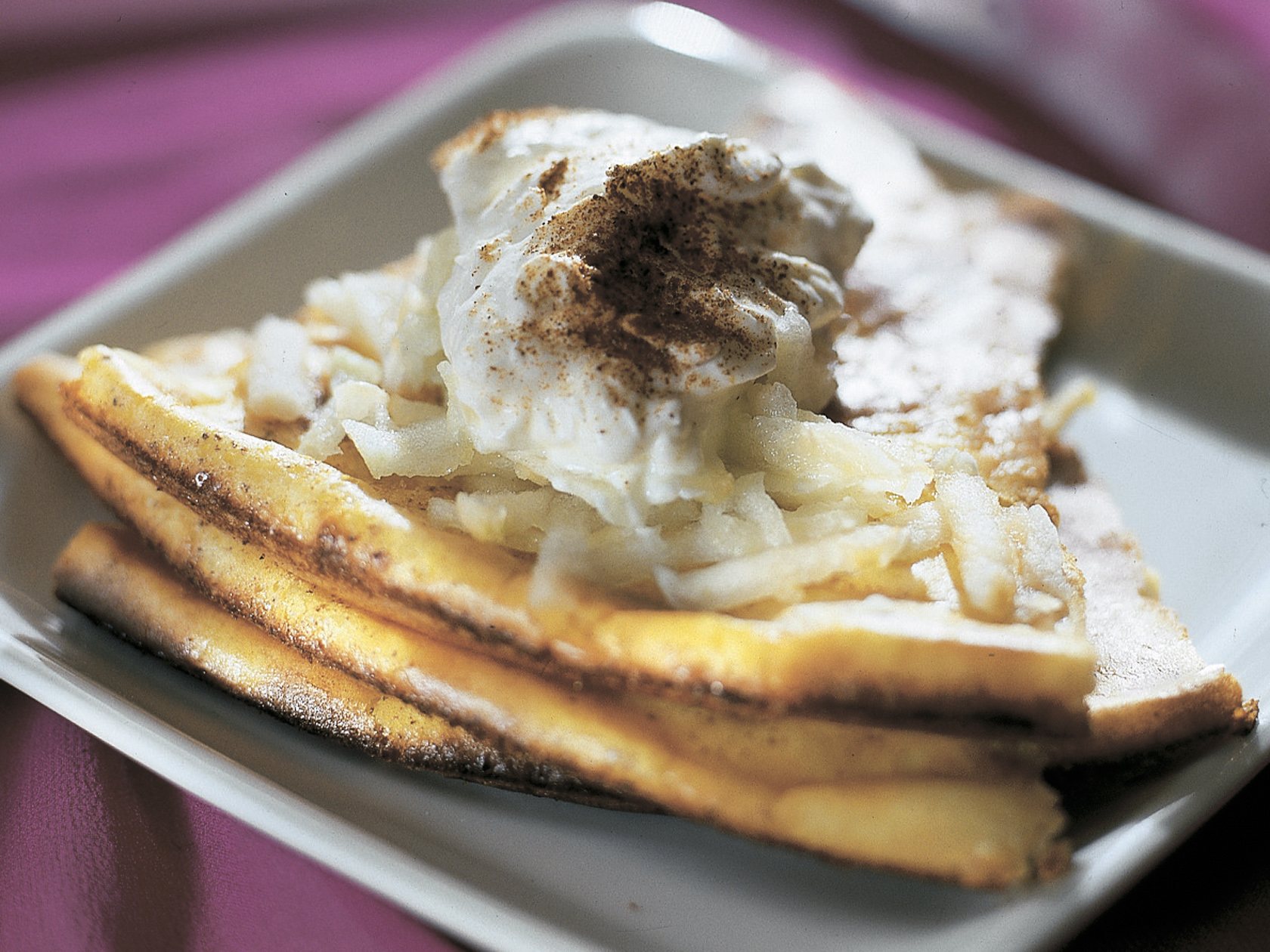 Kuori ja raasta omena hienoksi ja sekoita hyvin muiden aineiden kanssa. Anna taikinan vetäytyä lämpimässä noin ½ tuntia. Kaada taikina leivinpaperin päälle laidalliseen uunivuokaan ja paista 250 asteessa kypsäksi.