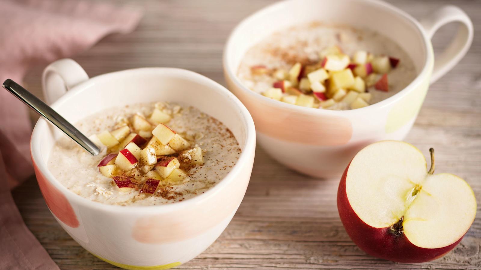 Sekoita rahkalla rikastettu tuorepuuro illalla jääkaappiin ja viimeistele aamulla tuoreilla omenakuutioilla.