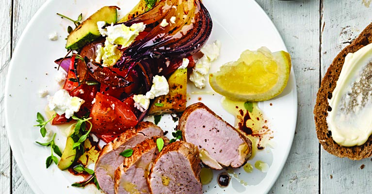 Leikkaa kasvikset suupalan kokoisiksi paloiksi. Mausta suolalla ja pippurilla, lisää pinnalle öljyä ja timjaminoksia. Levitä uunipellille porsaanfileen viereen. Paahda n. 15 minuuttia.