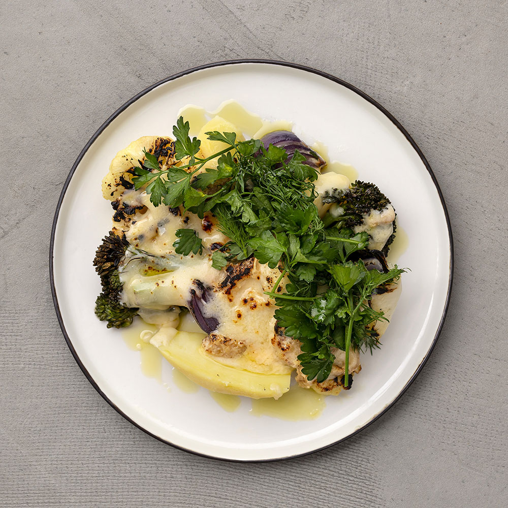 Lohko punasipulit, perunat ja kukkakaali. Pyöräytä öljyssä ja nosta uunivuokaan. Paahda 200-asteisessa uunissa niin, että kasvikset kypsyvät. Noin 30 minuutin jälkeen lisää broccolini ja jatka kypsennystä vielä n. 15 min.