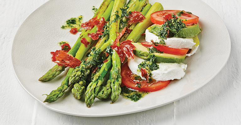Aseta lautaselle viipaloidut ainekset limittäin ja parsat niiden viereen. Murusta prosciutto ja lusikoi gremolata annoksen pinnalle.