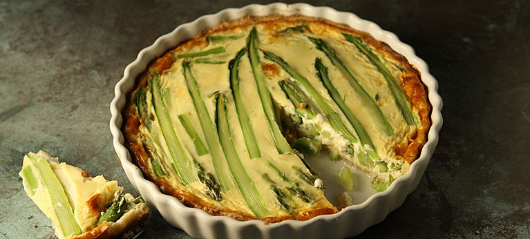 Asettele parsapalat piirakkapohjalle. Ripottele juustoraaste päälle. Vatkaa kananmunat, kerma ja maito. Lisää joukkoon espelettechili. Kaada vuokaan ja nosta uuniin. Kypsennä kunnes munamaito on hyytynyt, noin 35 minuuttia.
