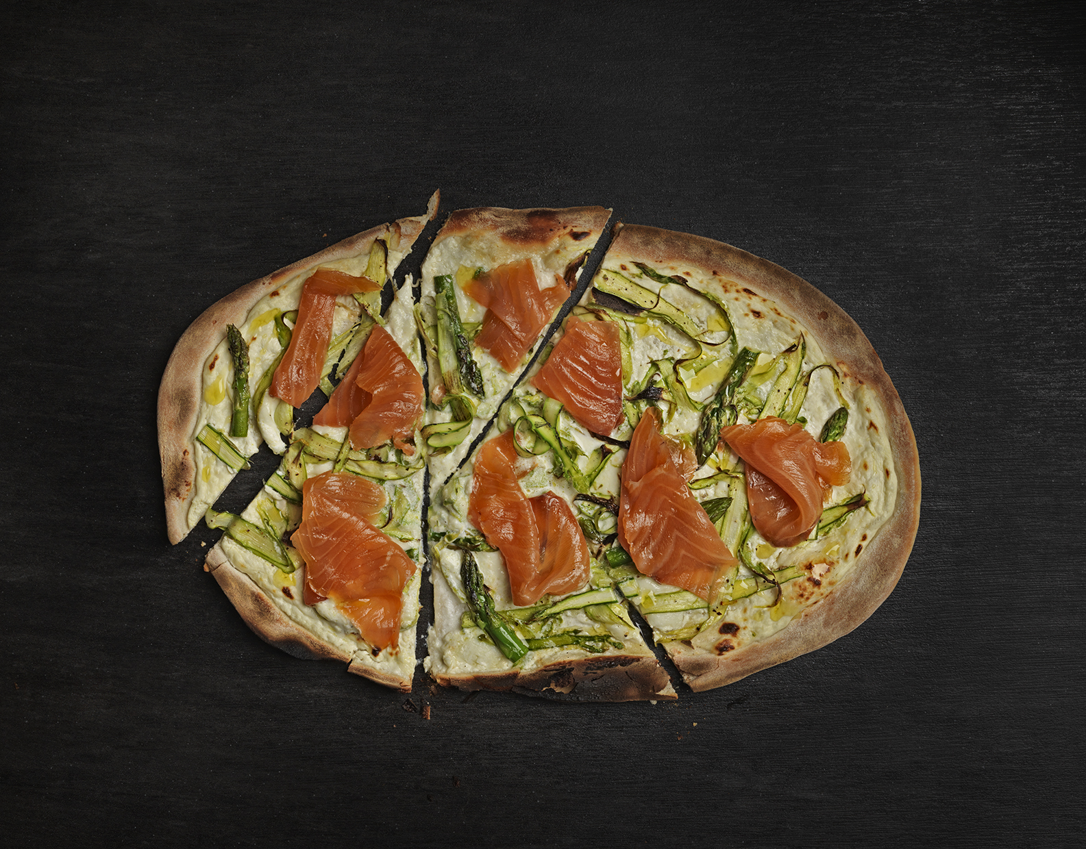 Höylää parsat ohuesti pituussuunnassa. Lisää parsasuikaleiden joukkoon oliiviöljyä ja mausta sormisuolalla ja mustapippurilla. Levitä parsat pizzan päälle.