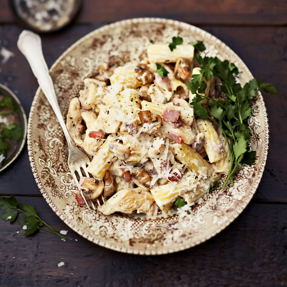 Keitä pasta kypsäksi pakkauksen ohjeiden mukaisesti suolalla maustetussa vedessä. Kaada pasta lävikköön ja valuta vesi pois. Tarjoile kana-pekonikastikkeen kera syvistä lautasista.