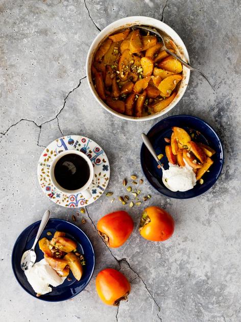 Persimonlohkot maustetaan kardemummalla ja vaniljalla, ja haudutetaan uunissa ihanan pehmeiksi. Tarjoile paistos pistaasipähkinöiden ja vaniljajäätelön kera.