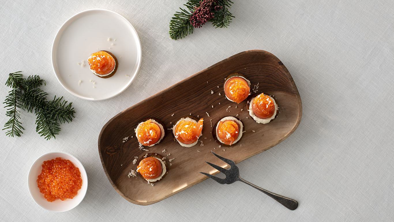 Pursota maustettu fraiche rieskojen päälle, lisää lohiruusuke, mätiä sekä tilliä koristeeksi.
