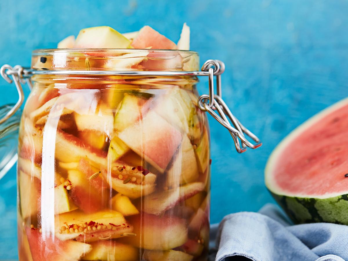 Vältä hävikki ja hyödynnä vesimelonista myös kuoret. Inkiväärillä ja mausteilla ryyditetty pikkeliliemi maustaa ja rapeuttaa kuoret herkullisiksi.