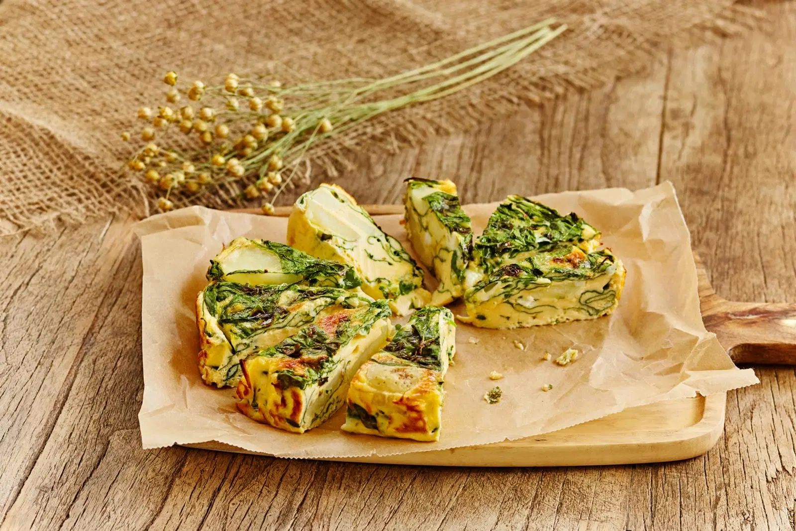 Kypsennä munakasta 175-asteisessa uunissa noin 30 minuuttia tai kunnes seos on hyytynyt. Ruskista pinta nopeasti uunissa kuumien grillivastusten alla. Leikkaa annospaloiksi.