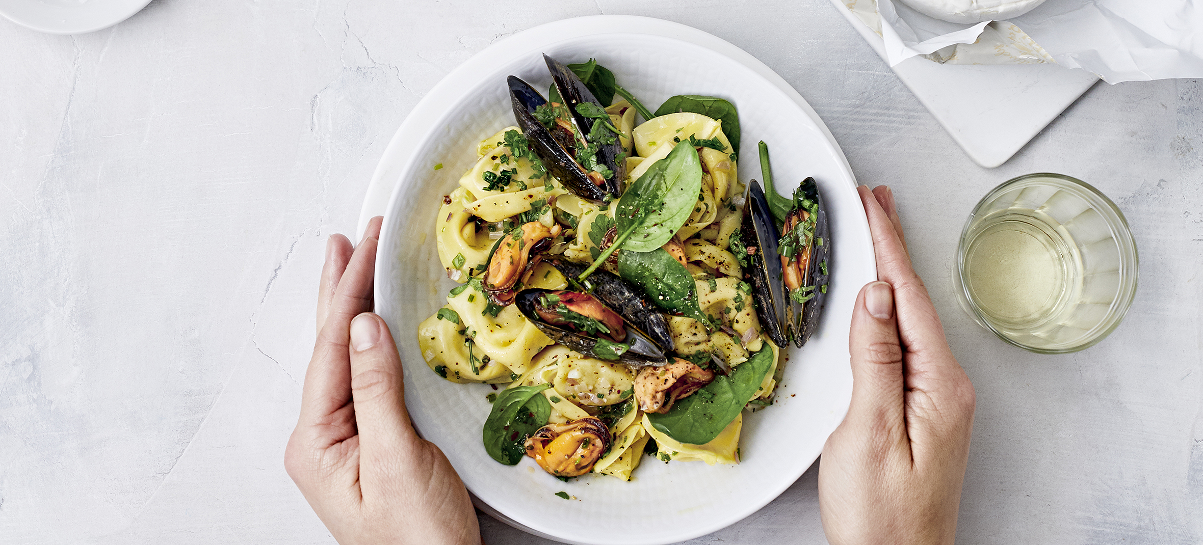 Kuori ja hienonna sipulit. Kuullota ne öljyssä kypsiksi. Lisää pannulle simpukat, pinaatit ja lehtipersilja. Mausta sitruunamehulla ja kuoriraasteella.