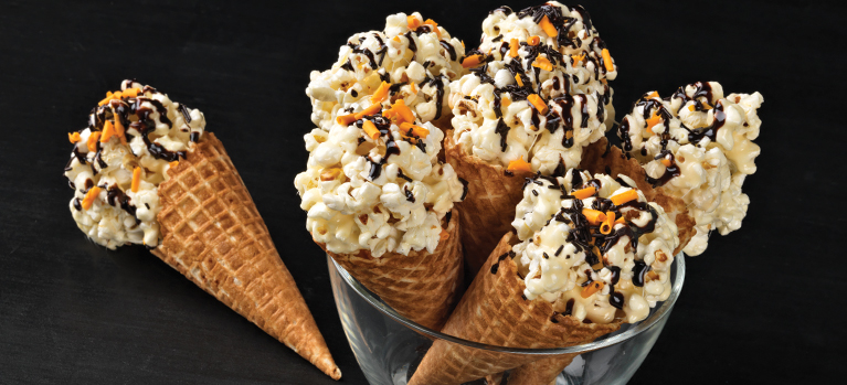 Aseta pallo varovasti vohvelin pääle. Valuta ohuita suklaaraitoja popcornipalloihin. Anna kovettua pystyasennossa.