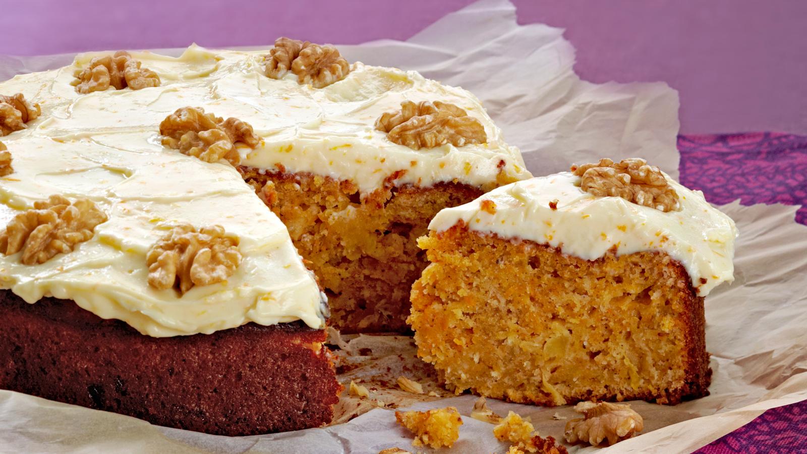 Valmista kuorrutus. Pese ja kuori appelsiinin kuori. Purista appelsiinista 1 rkl mehua. Yhdistä tuorejuusto, tomusokeri, appelsiininkuori ja -mehu. Levitä kuorrutus kakun päälle. Koristele pähkinöillä.