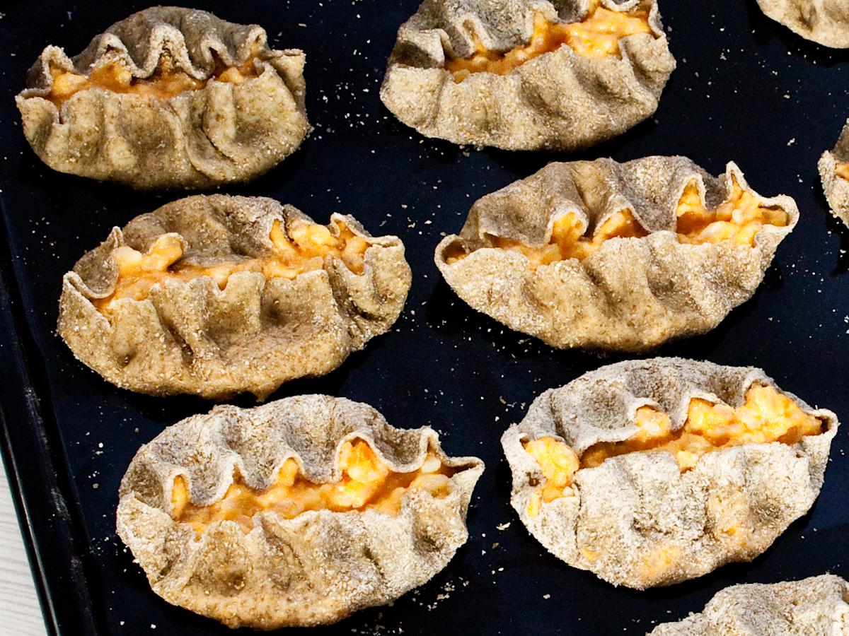 6Sudi jauhot pois. Levitä pari ruokalusikallista täytettä kuorille. Käännä reunat täytteen päälle ja rypytä molemmin etusormin yhtä aikaa keskeltä alkaen kärkeä kohden, käännä ja rypytä loppuun.