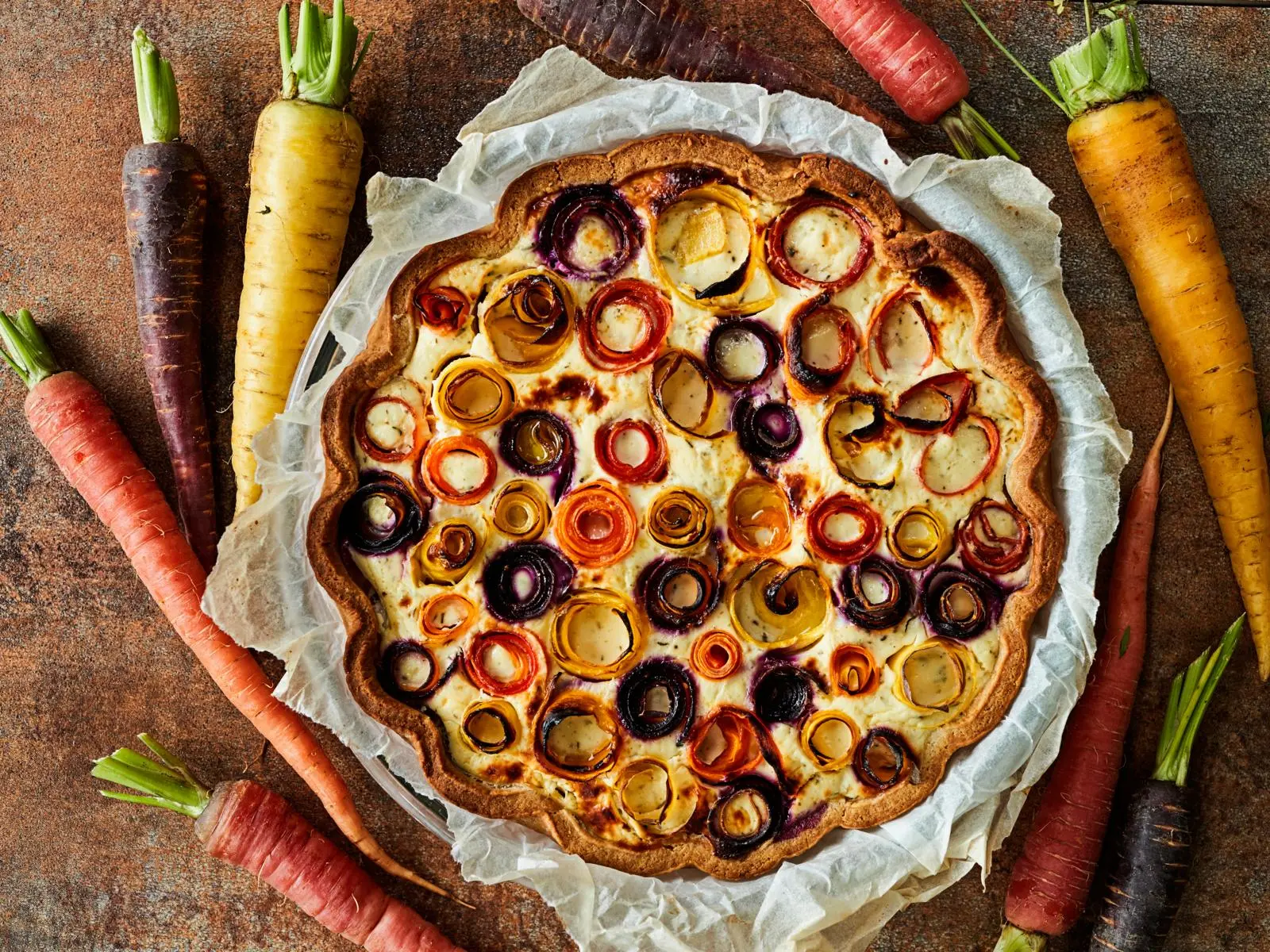 Korista suolainen piirakka perinteisillä oransseilla tai värikkäillä porkkanoilla. Valmispohjaa käyttämällä aikaa jää porkkanoiden rullailuun.