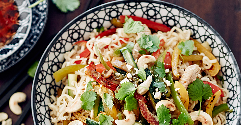 Käännä keitetyt nuudelit wokkiin ja viimeistele pähkinöillä.