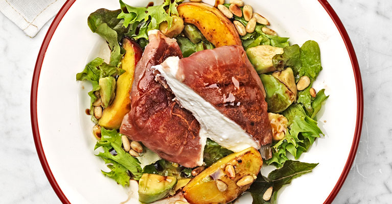 Lisää neljälle lautaselle salaattia, avokadoa ja nektariinia sekä prosciuttoon kiedottu chevre. Koristele pinjansiemenillä ja haluamillasi yrteillä, tarjoile heti.
